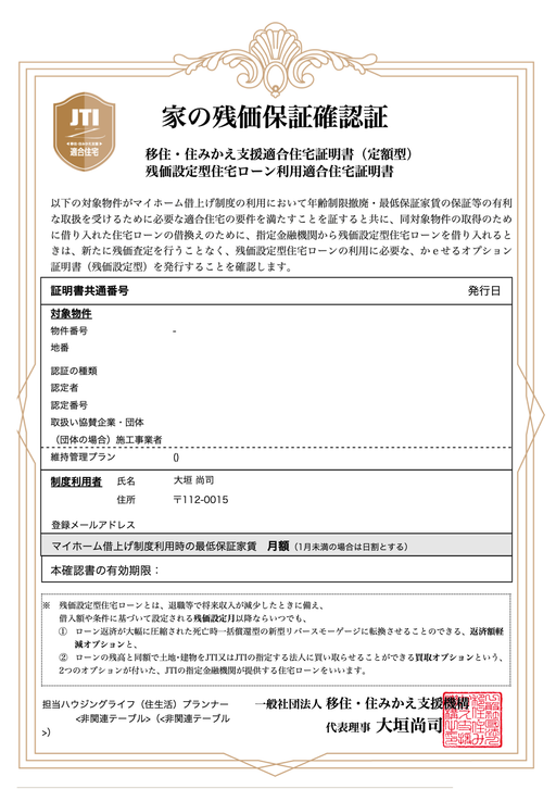 - 残価設定型住宅ローンの借入れや「家の残価保証確認証」の発行が可能かどうかは、この証明書で確認できます。