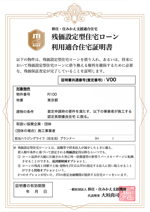 - 残価保証の利用条件を満たした家(※1)には、住宅事業者の申請により、JTIがあらかじめ「残価設定型住宅ローン利用適合証明書」を発行します。